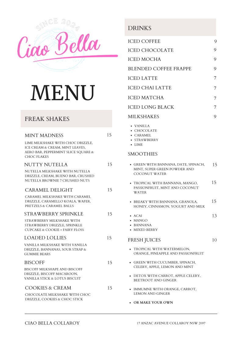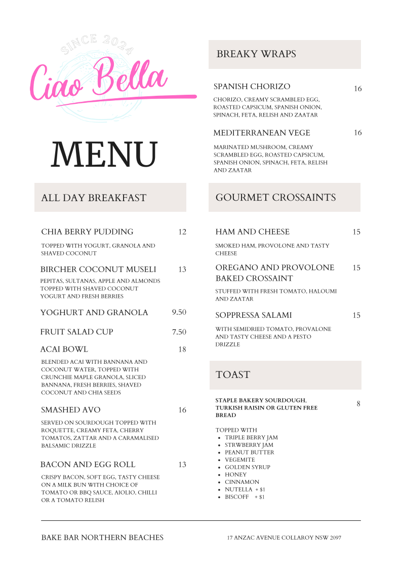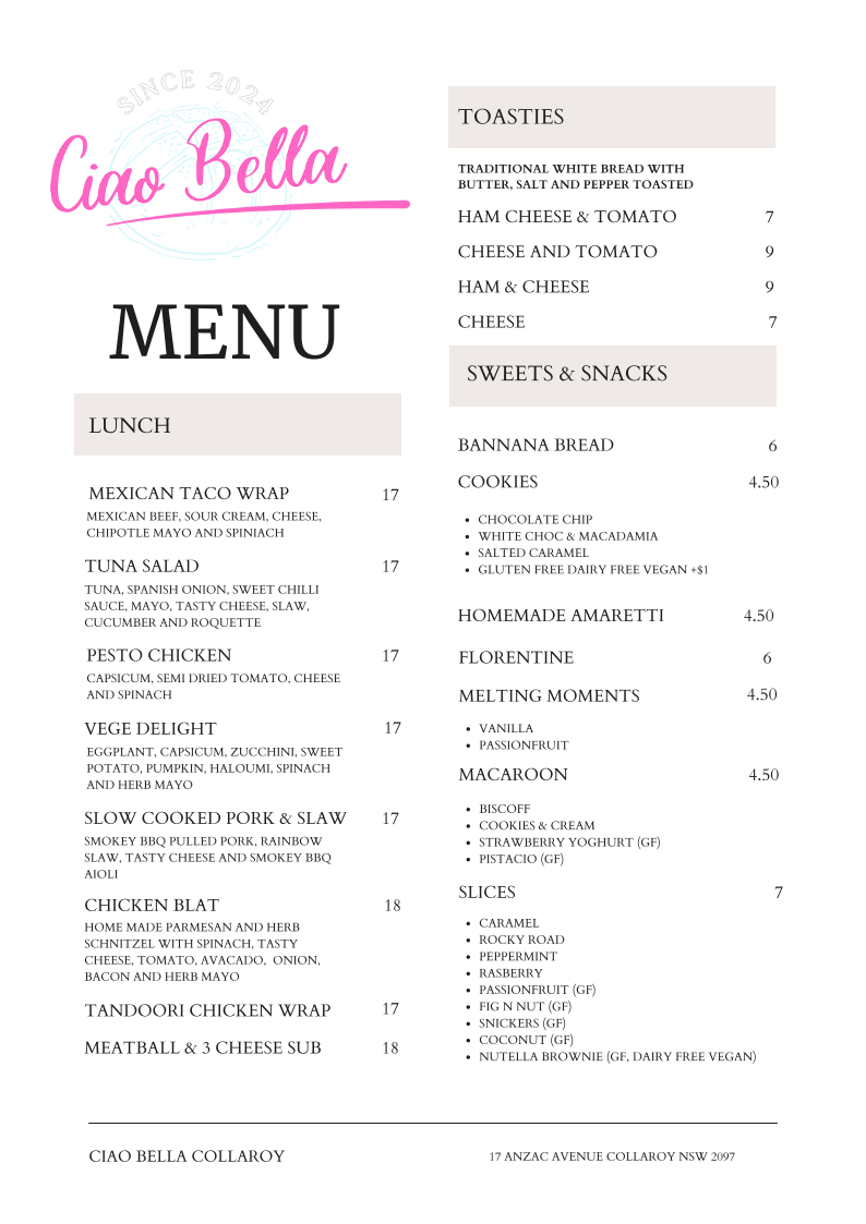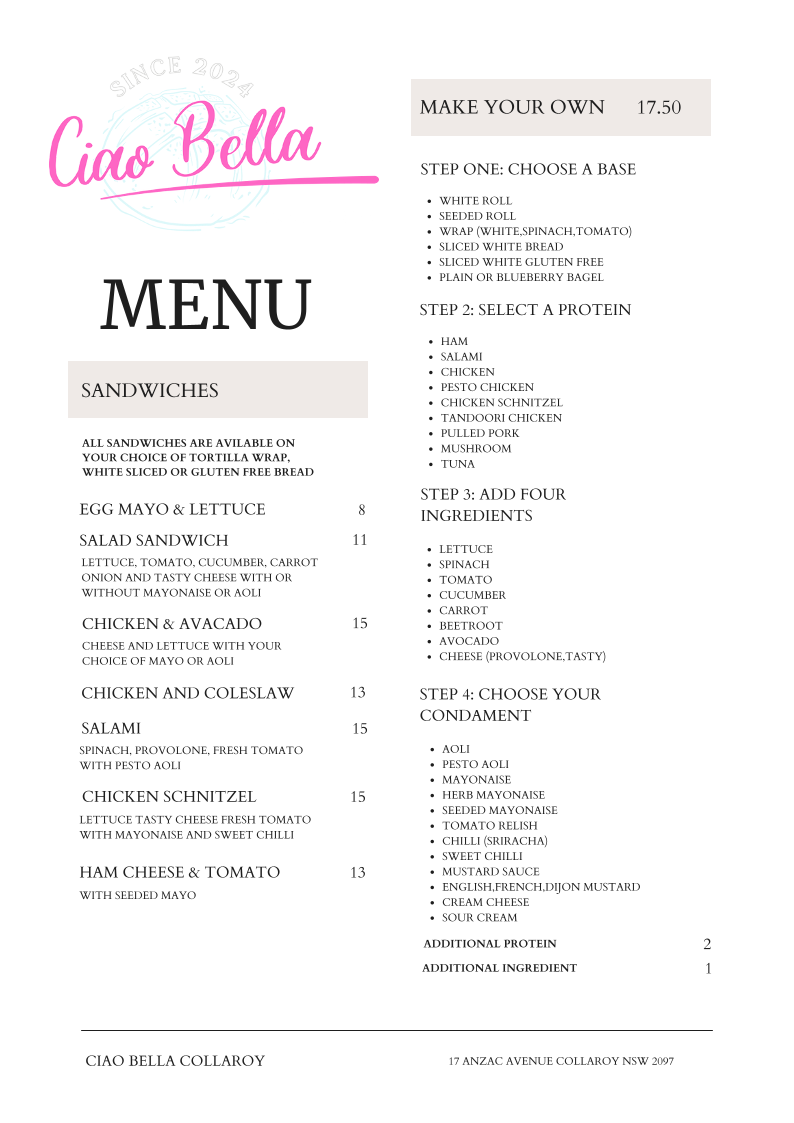Ciao Bella Collaroy Menu